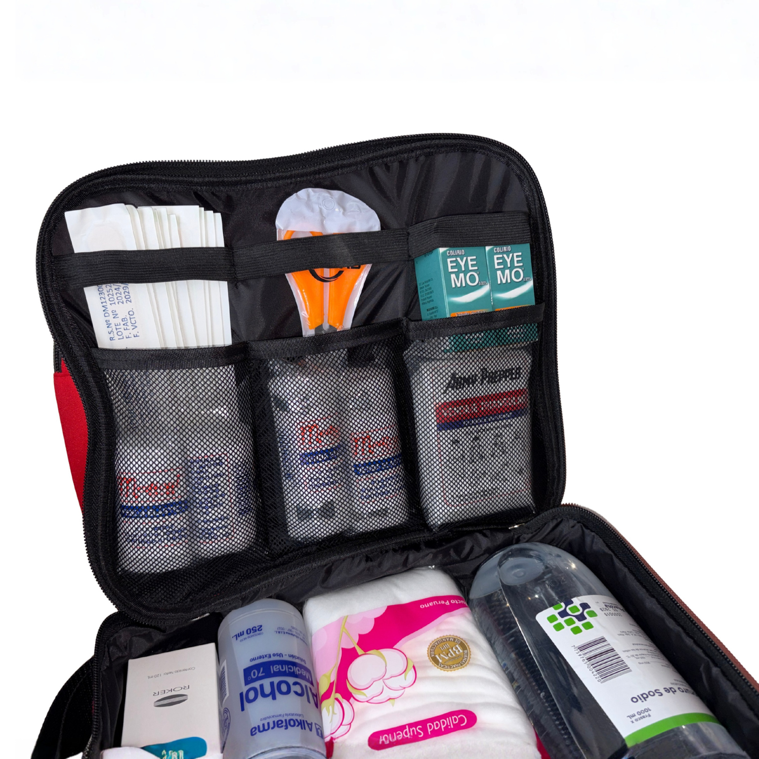 El botiquín de primeros auxilios ideal para implementos medianos y hasta grandes. Compacto y práctico para el almacenamiento y traslado; y a la vez espacioso y con una serie de ligas y