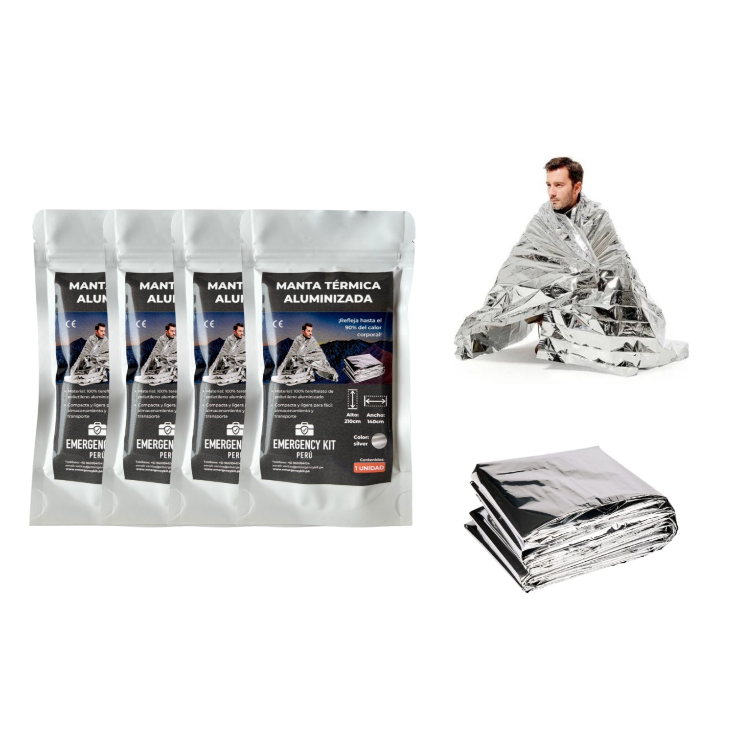 – x4 Manta térmica aluminizada: 1.40 x 2.10mts, con tecnología de tereftalato de polietileno aluminizado, que refleja hasta el 90% del calor corporal.