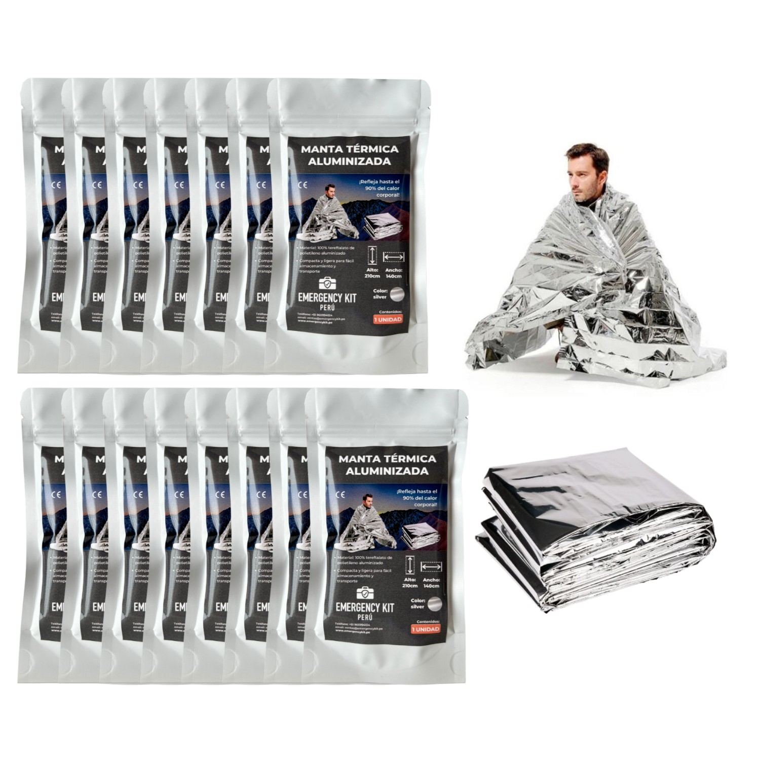- x15 Manta térmica aluminizada: 1.40 x 2.10mts, con tecnología de tereftalato de polieyileno aluminizado, que refleja hasta el 90% del calor corporal.